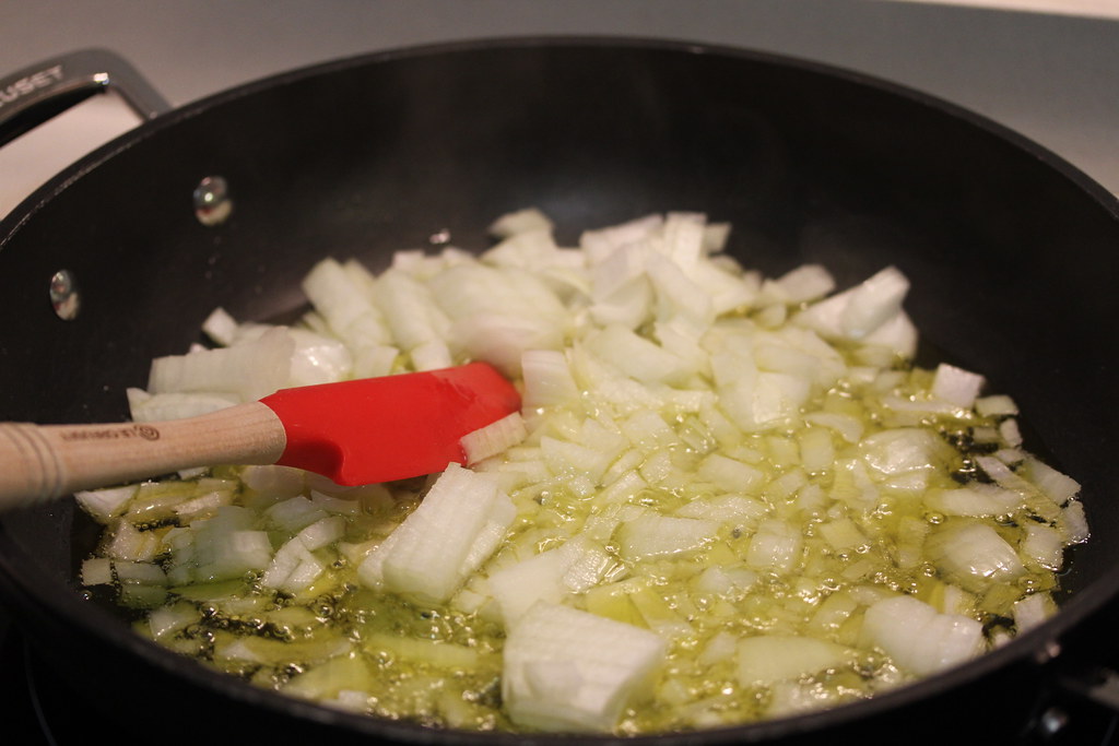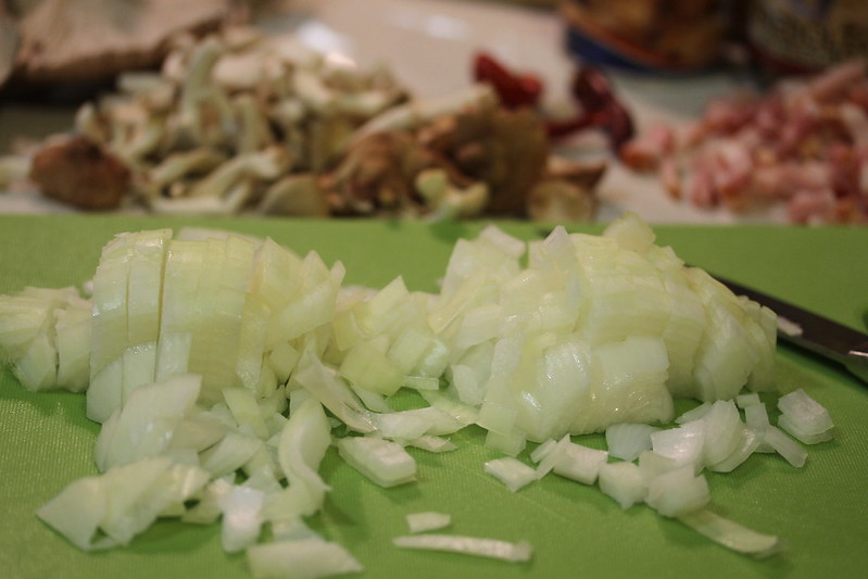 Picamos la cebolla y el apio. Lo mejor es que los cortemos en trozos muy pequeños para que se deshagan en el sofrito. Al final casi no notaremos la textura de ninguno de los ingredientes pero sí su sabor. El ajo es mejor cortarlo muy fino o hacerlo casi puré con el machaca-ajos.Haremos lo mismo con las setas pero en trozos un poco más grandes, pues como tienen mucha agua se quedarán en nada y queremos que se vean en el plato.Cortamos las setas de cardo en láminas y el resto en cuartos.En el caso de los Boletus, lo primero que haremos será pelar un poco el tronco y limpiar bien toda la tierra. Si están sanos ya habremos acabado, si no les retiraremos la partes blandas o con mucho hueco, feas o insanas.Si vemos que el sombrero del boletus trae una pequeña esponja de color amarillo, se la quitaríamos, si está blanca ya sería comestible.Lo más sencillo para que nos queden de una forma uniforme al cortarlos es realizar un corte horizontal en la base y vamos laminando.