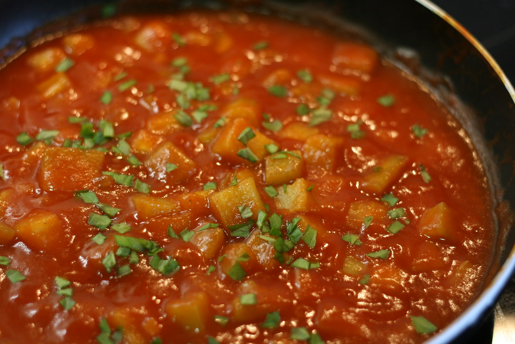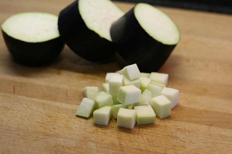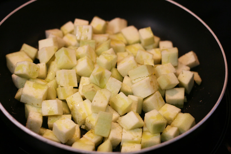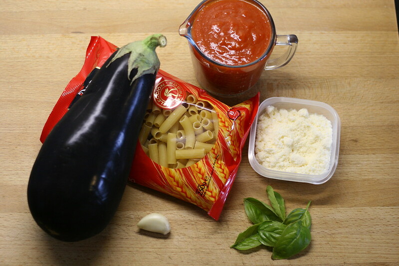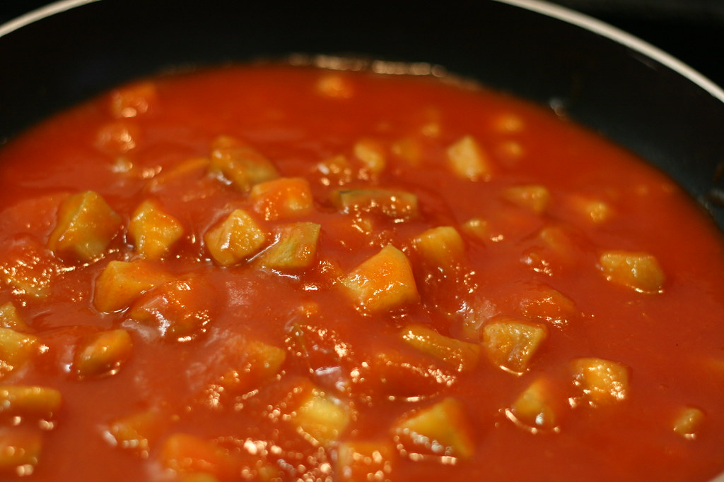 Pelamos y picamos el ajo fino. Lo ponemos a freír en una sartén con una lámina de aceite de oliva virgen extra.Retiramos el rabillo y las hojas a las berenjenas. Las cortamos en rodajas grandes y las pelamos. Ahora picamos en dados. Añadimos de inmediato a la sartén, para que no se oxide y escurezca.Cocinamos 5 minutos a fuego medio, removiendo de vez en cuando. Queremos que se vaya haciendo lentamente, sin quemarse, y nos resulte lo más tierna y jugosa posible.Vertemos la salsa de tomate casero y mezclamos bien. Si no disponéis en casa de vuestra conserva de tomate frito, encontraréis en las tiendas marcas de buena calidad, con salsas elaboradas naturalmente.Separamos las hojas de albahaca fresca, las lavamos y picamos finamente, como si fuese el caso del perejil. Repartimos uniformemente sobre la salsa, mezclamos y dejamos cocinar (a fuego medio) el conjunto mientras hacemos la pasta.